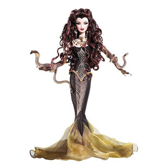 Jak widzicie na zdjęciach lalka wygląda cudownie, na żywo wygląda cudownie (tak, nadużywam tego słowa ;) ). Ciało lalki to model muse z ruchomymi rękami. Ręce typu pivotal - ta lalka ma wystające paznokcie pomalowane na czerwono, do tego jej ręce mają pomalowane na zielono bez palcowe rękawiczki. Paznokcie u stóp też są pomalowane na czerwono. Mold to Mackie (1991) w przecudownym wydaniu. Te oczy są hipnotyzujące - mają zieloną tęczówkę z pionową źrenicą - taka jak jest u węży. Do tego zielone cienie wokół oczu i sztuczne rzęsy. Nad prawym łukiem brwiowym znajduje się mała kropeczka - pieprzyk. Usta lalki też są inaczej umalowane niż standardowo - bordowe kontury i czerwony środek. Całą stylizację kończą włosy - piękne, ciemne, pokręcone włosy. Linia włosów na czole jest też nietypowa robiąca taki ząbek na środku, a te włosy są zebrane na górze. W tej lalce wszystko jest dopracowane, jest naprawdę przepiękna. I cały jej wygląd jest majestatyczny - jak na grecką mityczną postać przystało.